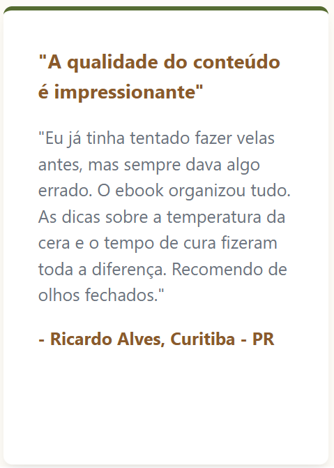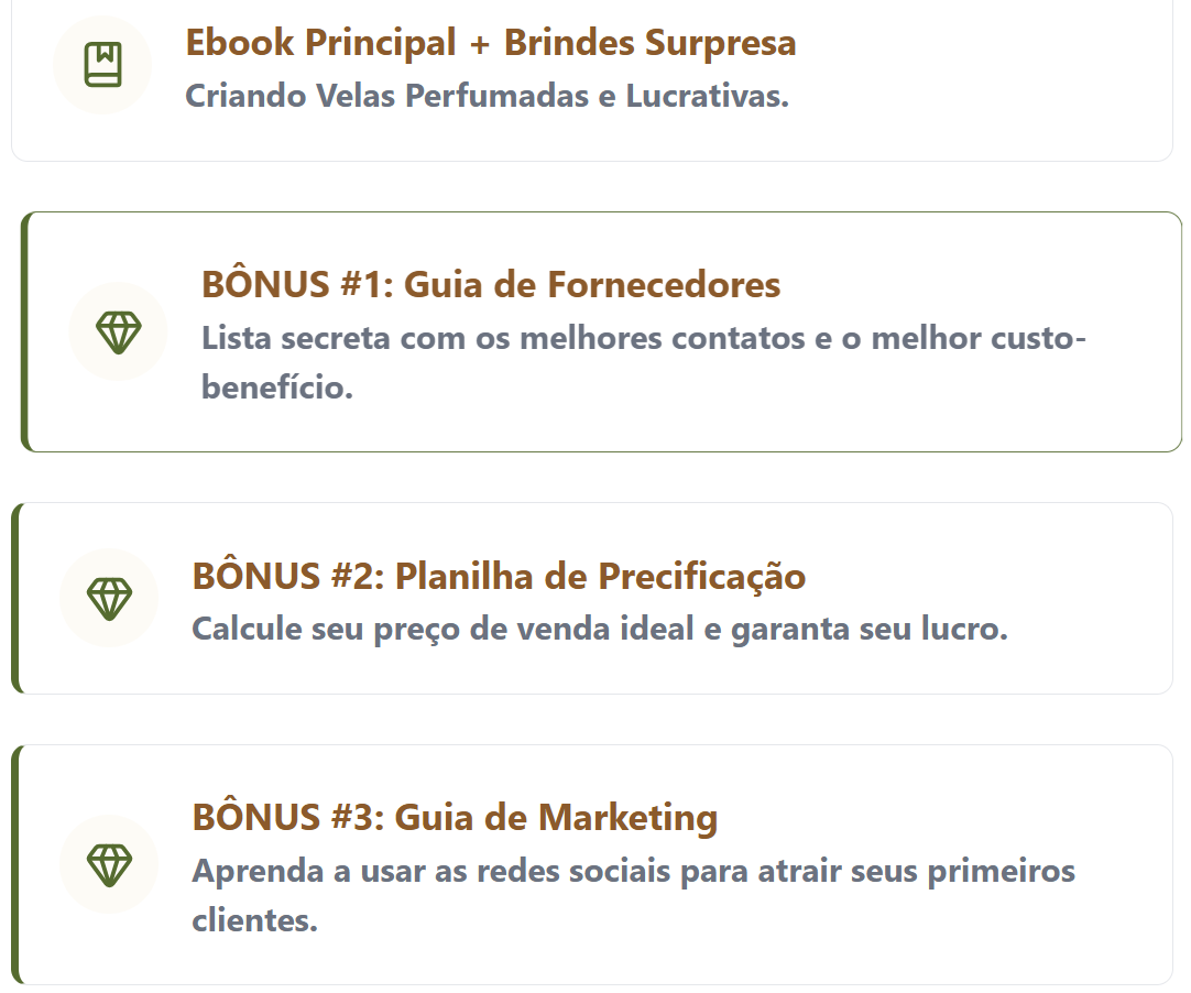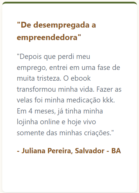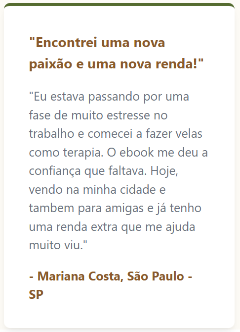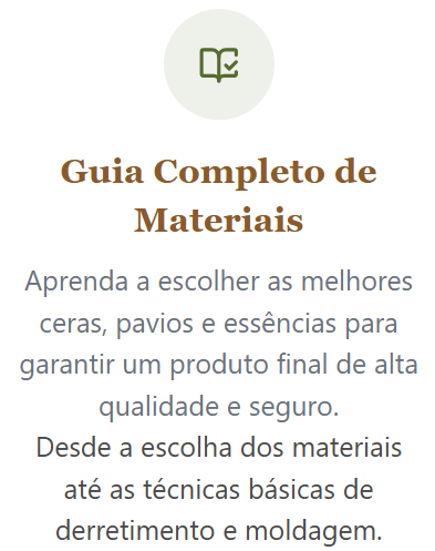 Por isso, decidi reunir tudo o que aprendi em um material completo, prático e direto ao ponto, pra te ensinar como criar velas incríveis, perfumadas e lucrativas, mesmo que você nunca tenha feito uma antes.